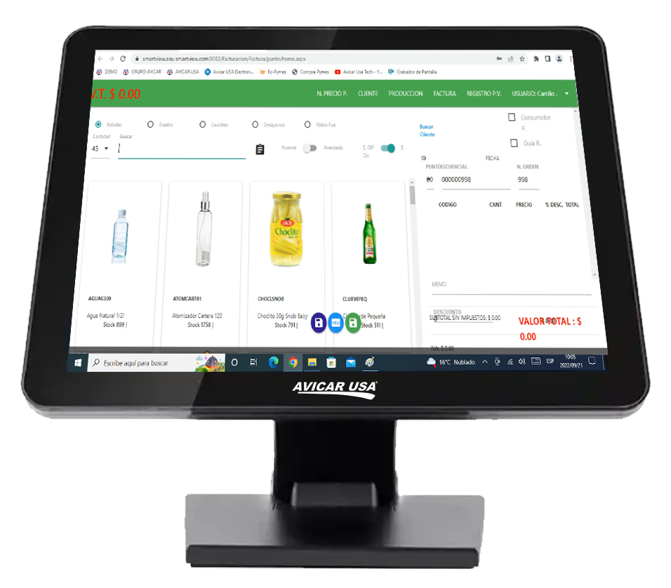 - Pantalla LED/LCD: 15” Táctil Multipunto